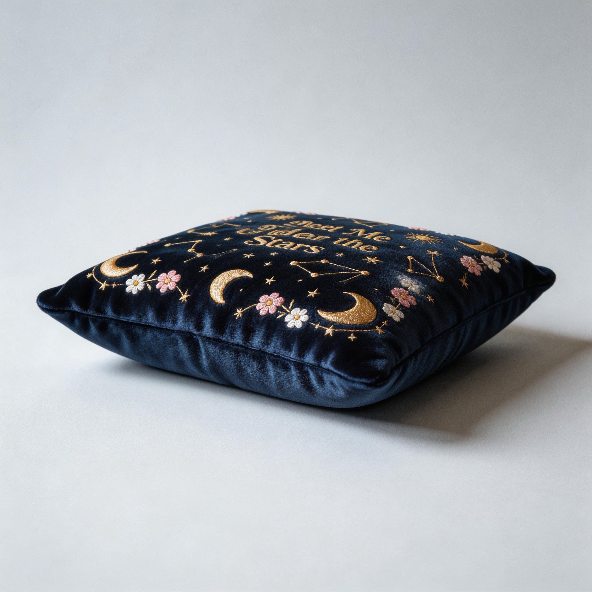 Adorned with delicate celestial patterns and the tender phrase "Meet Me Under the Stars," this is more than just a cushion—it's an invitation to believe in wonder.